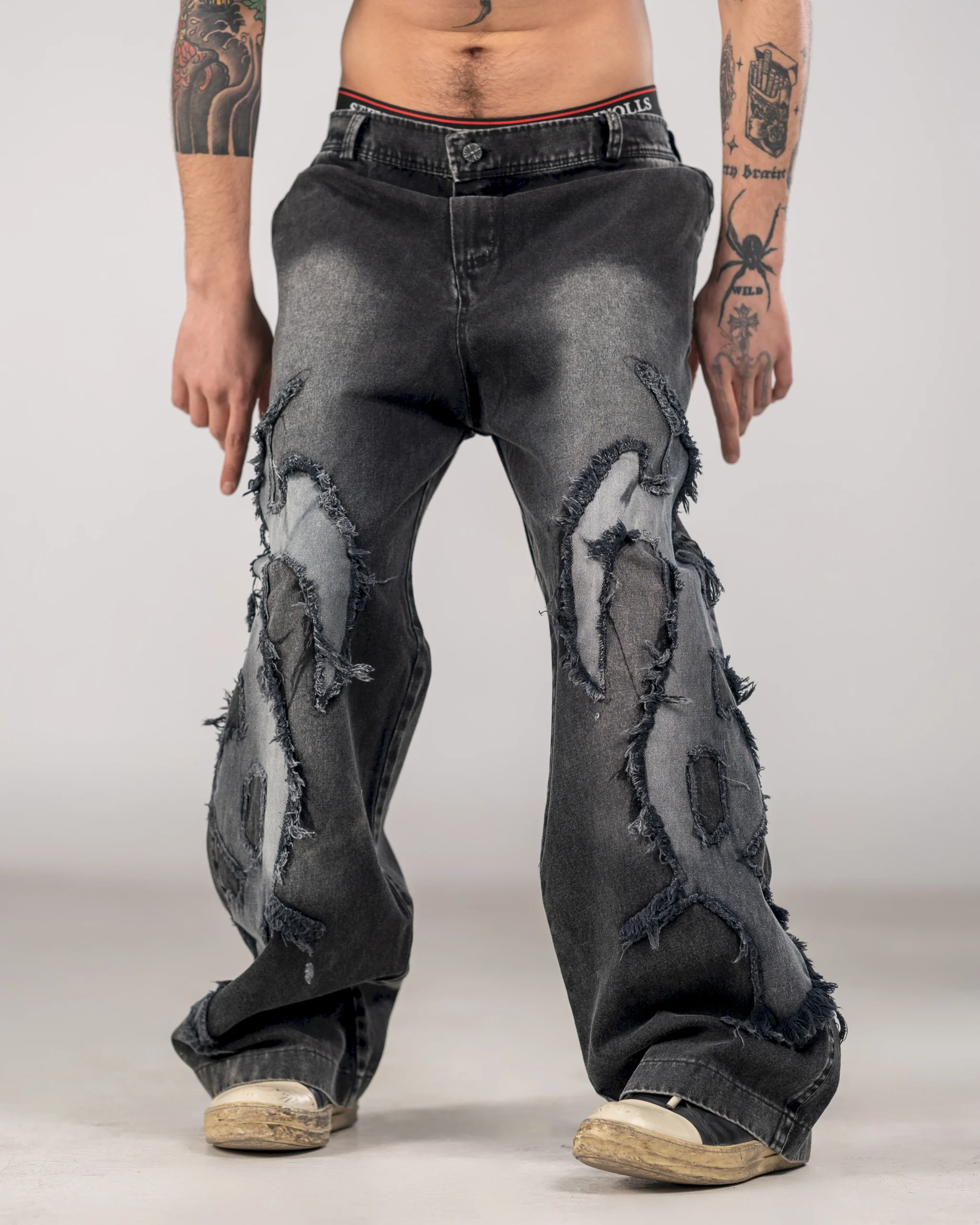 پچهای دیسترسشده: در نواحی زانو و ساق برای القای حال و هوای خیابانی ریشه های نخ و پارچه کار شده